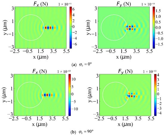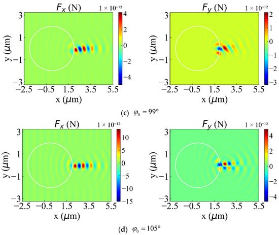 Optical force exerted on a nanorod with different φ0. Panels (a–d) show the optical forces Fx and Fy when , respectively.