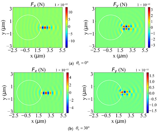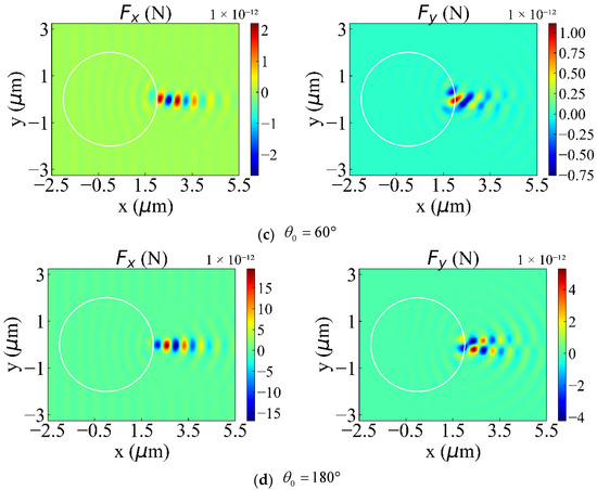 Optical force exerted on a nanorod with different θ0. Panels (a–d) show the optical forces Fx and Fy when , respectively.