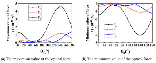 The maximum and minimum values of optical force varies with . (a,b) show the change rules of the maximum and minimum values of , , and in the process of θ0 increasing from 0° to 180°.