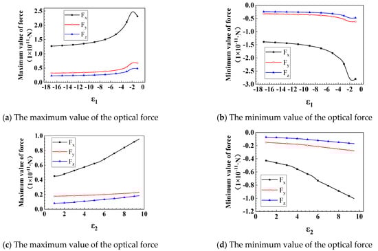 In this section, we discuss the effects of the real () and imaginary () parts of the nanorod’s dielectric constant on the optical force, as shown in Figure 11. The and R of GLLs are 1.2 and 2 μm. The wavelength is 0.6328 μm, and the volume of the nanorod is 4.2 × 10−3 μm3. In Figure 11a,b we show the maximum and minimum optical force changes with the real part () of the dielectric constant when the imaginary part of the nanorod’s dielectric constant is 1, respectively. From the figures, we can find that the optical force first increases and then decreases with the increase of . When , the optical force has the local maximum value. From Figure 11c,d, we can find that as increases, the optical force gradually increases.