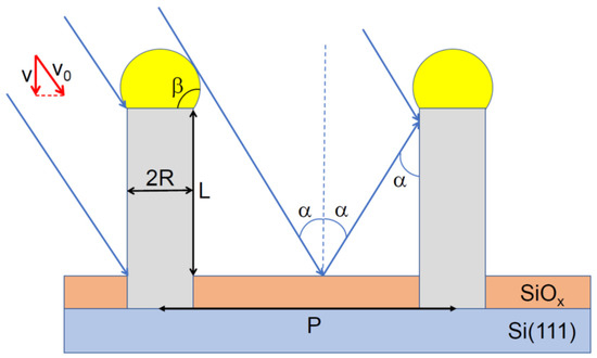 MBE growth of NWs on a reflecting substrate is illustrated in Figure 1. The group III flux onto the substrate surface equals , with as the total group III flux and as the beam angle with respect to the substrate normal. The nominal thickness of planar material deposited by the moment of time equals . I take into account re-emission (reflection) of group III atoms from the mask surface and shadowing of the mask by the NW array. Re-emission from the NW sidewalls or catalyst nanoparticles is neglected. Hence, any material exchange between the NWs [25,26] is not considered. Surface growth on the mask is assumed negligible. As mentioned above, all NWs in the array are considered identical in terms of their length and radius and modeled as cylinders with length L above the mask surface and uniform radius R.