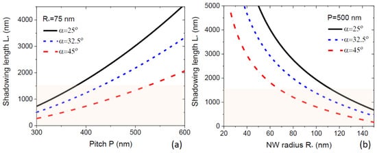 Here, is the NW radius and is the geometrical function of the droplet angle reached at the moment of time where . This depends on the NW radius because thicker NWs shadow a larger surface area, and hence the full shadowing of the mask occurs at a shorter NW length. The shadowing length is shown in Figure 3 as a function of the pitch (a) and radius (b) for different beam angles, at a fixed of 135°, corresponding to 2.0. As expected, the shadowing length increases with the pitch and decreases for thicker NWs and larger beam angles. The radial NW growth will never occur