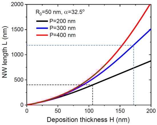 Evolution of the NW length with deposition thickness at a fixed NW radius of 50 nm for 32.5° and three different pitches shown in the legend. The curves are obtained from Equations (11)–(13) using the parameters summarized in Table 1. NW length increases with the pitch for a given . Fast elongation in the initial stage is followed by a linear increase after the full shadowing of the mask surface, which occurs later for larger pitches. Dashed markers show the corresponding and for 200 and 300 nm. The shadowing length is larger than 2000 nm for 400 nm.