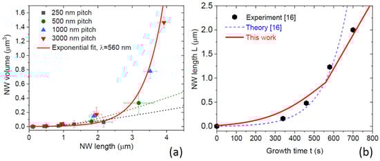 Catalyst-free InAs NWs of Ref. [20] were grown by SAG-MBE in patterned arrays of pinholes in SiO2/Si(111) at 480 °C. Square arrays with pitches ranging from 250 to 3000 nm were investigated by measuring the average values of the NW lengths and diameters grown under identical conditions for different times. The data for the average values of NW lengths and diameters are given in Table 3, with the corresponding error bars shown in Figure 7a. Both lengths and diameters increased sublinearly with time [20]. However, if one plots the NW volume versus length, the exponential dependence fits all the datapoints within the error bars. The best fit is obtained using Equation (19) with 560 nm and 50 nm, as shown in Figure 7a. Including the shadowing effect, which is important for the smallest pitches, leads to the curves shown by the dashed lines in Figure 7a.