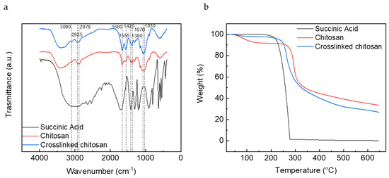 TGA curves for the succinic acid, chitosan, and crosslinked chitosan samples are shown in Figure 4b. The incorporation of succinic acid in crosslinked chitosan tends to shift the thermal decomposition region of succinic acid to higher temperatures due to crosslinking. After complete decomposition of succinic acid, the curve of chitosan and the crosslinked sample maintain the same trend. It could be seen that even if the samples have been dried before the measurement, chitosan still retains some water, as shown by the mass decrease around 100 °C.