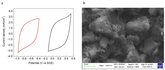 To assess if the crosslinked binder is stable over electrode cycling, and given that the performance of the synthesized NTP is affected by the electrochemical stability window of the electrolyte [29], the activated carbons used as counter electrodes in the cell with NTP were also tested. The CVs of these electrodes in Na2SO4 display a typical capacitive behaviour. The material is stable in a wide range, nearly 1.5 V from −1.0 V to 0.5 V vs. SCE. Figure 6a displays the CVs of the negative and positive electrodes of an AC//AC cell vs. the Ag pseudoreference electrode, and Figure 6b, the SEM images of one pristine electrode.