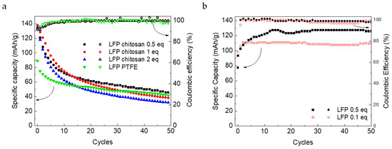Specific capacity and coulombic efficiency value for LFP electrodes with different binders in LFP/FP cells: (a) chitosan crosslinked with 2, 1, and 0.5 equivalents of EDC and PTFE as a binder in 1 M Li2SO4 aqueous solution and (b) chitosan crosslinked with 0.5 and 0.1 equivalents of EDC in organic electrolyte (LP 30).