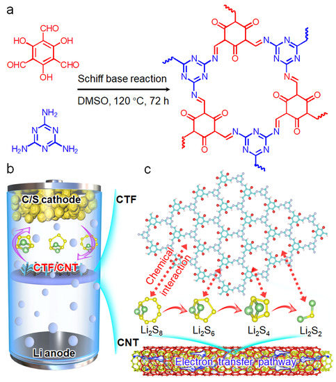 (a) Synthesis procedure of CTF based on a Schiff base reaction. Schematic illustration of (b) the Li–S cell using the CTF/CNT/Celgard separator and (c) the structure of the CTF/CNT composite and its interaction with polysulfides.