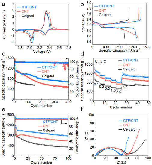 To evaluate the effect of the CTF/CNT/Celgard separator on the electrochemical performance of Li–S batteries, 2032-type cells were assembled using Super P/S composite as the cathode material. The sulfur content in the Super P/S cathode was ~69 wt.% (Figure S7), and the mass loading of sulfur on the electrode was about 1.2 mg cm–2. For comparison, Li–S batteries using pristine Celgard separator and CNT/Celgard separator were also assembled. Figure 4a shows the cyclic voltammetry (CV) curves of all cells measured within a potential range of 1.7–2.8 V and at a scan rate of 0.1 mV s−1. All CV curves exhibited typical characteristics of the electrochemical redox reaction of sulfur. The two reduction peaks were attributed to the conversion reaction from solid cyclic S8 molecules to soluble long-chain Li2Sn (4 ≤ n ≤ 8) and further conversion to insoluble Li2S2/Li2S. The oxidation peak corresponds to the reaction process of insoluble Li2S2/Li2S converting to solid S8 [43,44,45]. Compared with the cells using the Celgard separator, the cell using the CTF/CNT/Celgard separator exhibited higher reduction voltage and lower oxidation voltage, indicating the faster redox kinetics promoted by the CTF/CNT composite. The cell using the CNT/Celgard separator had lower current density compared to the battery using the Celgard separator This was because the cell using the CNT/Celgard separator requires activation in the initial cycles (Figure 4e). To further investigate the effects of the modified separator in improving the reaction kinetics, CV curves at different scan rates (v) were further measured. The lithium ion diffusion coefficient of Li–S batteries using the CTF/CNT/Celgard, CNT/Celgard, and Celgard separators was calculated based on the Randles–Sevick formula to reveal the difference in the reaction kinetics (Figure S8a–c). The peak current (Ip) and v1/2 of different cells at different stages of reaction (i.e., α, β, γ peaks) were plotted and linearly fitted to obtain the slope value (Figure S8d–f). The battery using the CTF/CNT/Celgard separator had a comparable lithium ion diffusion coefficient with the battery using the Celgard separator (Table S1), indicating that the CTF/CNT interlayer does not hinder the diffusion of lithium ions. All of these results indicate that the CTF/CNT interlayer promotes the reaction dynamic of the Li–S battery without affecting the lithium ion diffusion. The initial galvanostatic charge–discharge curves of Li–S batteries using different separators are compared in Figure 4b. CTF/CNT modified separator showed the lowest overpotential, which was consistent with the results of CV. Figure 4c describes the cycle performances of the Li–S cells, which were pre-cycled at 0.1 C for three cycles before cycling at 1 C. The initial capacity of the cell with the CTF/CNT/Celgard separator was 1314 mAh g−1, while the initial capacity of the cells with the CNT/Celgard separator and Celgard separator was 1356 and 955 mAh g−1, respectively. At 1 C, the initial capacity of the cell with the CTF/CNT/Celgard separator was 1145 mAh g−1 and remained at 684 mAh g−1 after 400 cycles. The average Coulombic efficiency and capacity decay per cycle were 98.4% and 0.1%, respectively. In contrast, the capacity of the battery using the CNT/Celgard separator was 484 mAh g−1 after 400 cycles. The average Coulombic efficiency was 95.2%. The capacity of the cell with the Celgard separator rapidly decreased to 551 mAh g−1 after 150 cycles. The average Coulombic efficiency during the 150 cycles was 98.8%. The battery using the CTF/CNT/Celgard separator showed the best cycle stability because the polysulfide shuttling was attenuated. The capacity and cycle performance of Li–S battery using the CTF/CNT/Celgard separator were also superior to the Li–S batteries using various functional interlayers (Table S2).