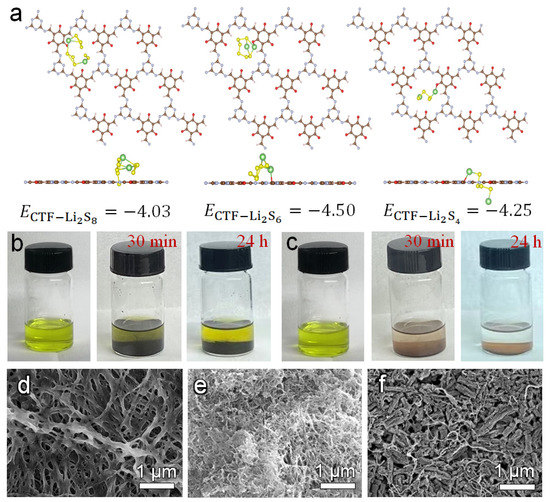 (a) DFT calculations of Li2S8, Li2S6, and Li2S4 adsorption on CTF, static-adsorption experiments of (b) CNT and (c) CTF in a Li2S4 solution. SEM images of (d) the Celgard separator, (e) CNT/Celgard separator, and (f) CTF/CNT/Celgard separator after cycling.