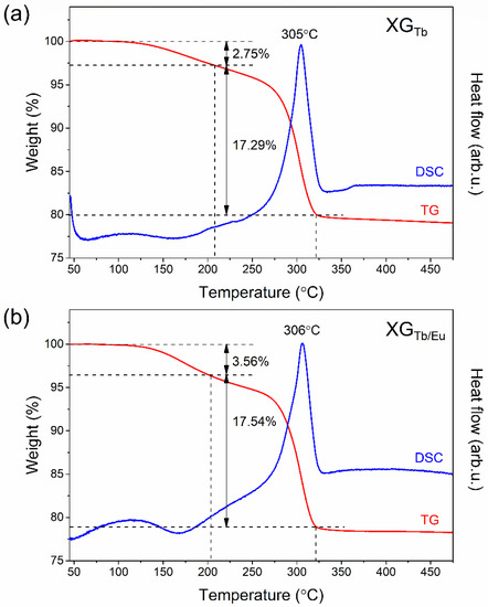Figure 1 presents the TG/DSC curves recorded for fabricated xerogels in an inert gas atmosphere in a temperature range from 45 °C to 475 °C (the heating rate during measurement was 10 °C/min). According to TG curves, there are two distinguishable degradation steps for both fabricated samples: first, identified at 45–(~205) °C, and second, observed in the temperature range (~205) °C–(~320) °C. A slight weight loss, about 2.75% (XGTb) and 3.56% (XGTb/Eu), is associated with the elimination of residual solvents (ethyl alcohol, acetic acid) and water from the porous sol–gel host. At higher temperatures, strong exothermic peaks with maxima at 305 °C (XGTb) and 306 °C (XGTb/Eu) were identified, which appear along with ~17.55% weight loss. Generally, trifluoroacetates tend to decompose at temperatures near ~300 °C, which is well documented and described in the current literature [24,25,26]. Thus, recorded exothermic DSC peaks are clearly correlated with thermal decomposition of Ba(TFA)2 and crystallization of BaF2, which could be given by the chemical reaction: