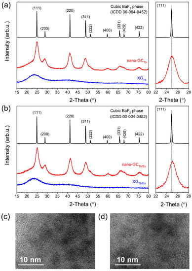 XRD patterns of prepared sol–gel samples: Tb3+ singly doped materials (a) and Tb3+, Eu3+ co-doped specimens (b). The standard data for the BaF2 cubic phase (ICDD card no. 00-004-0452) are also shown for comparison. TEM images revealed the presence of fluoride crystals in glass-ceramics singly doped with Tb3+ (c) and co-doped with Tb3+, Eu3+ (d).