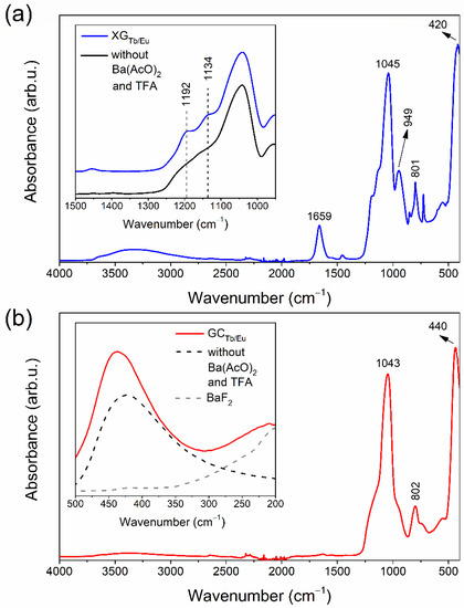 The ATR-IR spectrum within the 4000–400 cm−1 region registered for a representative nGCTb/Eu sample obtained at 350 °C is shown in Figure 3b. Compared with the ATR-IR spectrum for XGTb/Eu, the intensities of signals at >3000 cm−1 and 1659 cm−1 weakened significantly, which allows us to make conclusions about evaporation of volatile chemical components from the sol–gel host and progressive reactions between unreacted Si–OH groups. Additionally, it was also observed that for the nGCTb/Eu nano-glass-ceramic sample, the intensity of the IR signal near ~949 cm−1 is weaker than for the XGTb/Eu xerogel sample. An indicated effect may also suggest a continuation of polycondensation because Q2 units probably transformed into Q3 and Q4 ones, which favor the creation of a more cross-linked sol–gel host. It was also observed that intensities of IR signals near ~1134 cm−1 and ~1192 cm−1 weakened compared with those recorded for the xerogel. This effect could be explained by thermal decomposition of Ba(TFA)2 compound into BaF2 crystals within the prepared silicate sol–gel host in the proposed heat-treatment conditions. Indeed, the Ba–F vibrations might be observed at lower frequencies (inset of Figure 3b), which agrees with the IR spectrum recorded for pure BaF2 [38]. The peak with a maximum at ~440 cm−1 was recorded for both nGCTb/Eu nano-glass-ceramics and an analogous sample prepared without the addition of Ba(AcO)2 and TFA, confirming that such a band is not related to the fluoride fraction but to the oscillations within the silicate host (O–Si–O vibration). It should be noticed that this band shifts toward a higher frequency for nano-glass-ceramics in comparison with the xerogel. The reason for such spectral behavior could be explained by differences in the inter-tetrahedra angle of SiO4 units in xerogels and glass-ceramics, as was stated in the literature [39].