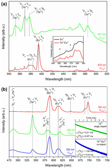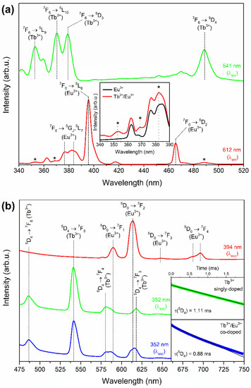 The excitation spectra recorded for Tb3+ (λem = 541 nm) and Eu3+ (λem = 612 nm) ions in fabricated amorphous xerogels. For the latter, the additional lines originated from Tb3+ ions were marked by asterisks (a). The registered luminescence spectra collected for XGTb (green line, λexc = 352 nm) and XGTb/Eu samples (blue line, λexc = 352 nm; red line, λexc = 394 nm). Inset shows the decay curves recorded for the 5D4 state of Tb3+ ions (b).