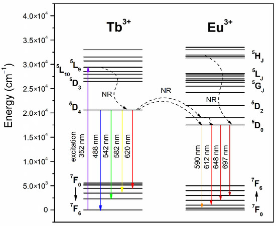 Hence, our experimental results indicate the occurrence of Tb3+/Eu3+ ET upon excitation at a 352 nm wavelength when Tb3+ ions are excited from the 7F6 ground state. Then, the electrons at the 5L9 level decay rapidly through the 5G5, 5L10, and 5D3 states by the multiphonon relaxation process until the 5D4 level is populated. Since there is the energetical resemblance of the 5D4 (Tb3+) and the 5D1/5D0 (Eu3+) levels, the Tb3+/Eu3+ energy migration is feasible, and the excitation energy is transferred from Tb3+ to the adjacent Eu3+ ion. The acceptor ions relax from the 5D0 state to the 7FJ levels, promoting the light emission within the reddish-orange spectral region [43]. The ET is schematized in the level diagram presented in Figure 5.