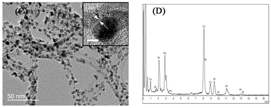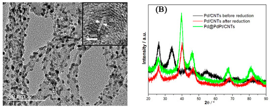 The as-prepared surfactant-free Pd/CNTs was allowed to be stirred in [PtCl4]2− solution for the galvanic replacement to yield Pd@PdPt/CNTs. After decoration by Pt, no apparent changes in morphology are observed, as shown in Figure 1c. However, a d-spacing of 2.28 Å correlating with the [111] crystal plane is obtained by the HR-TEM (inset of Figure 1c), indicating the formation of a PdPt alloy [31,32,33,48]. The slight increase in d-spacing was further confirmed by XRD measurement in which a slight decrease in all diffractions peaks is observed. Furthermore, the EDX analysis also proves the presence of the Pt with the atomic ratio of Pd to Pt of 2.6:1 as shown in Figure 1d.