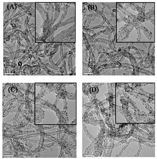 Furthermore, the introduction of [PdCl4]2− to CNTs led to a decrease in the solution pH by 2 (Table 1), which implies that hydrolysis takes place. To investigate the effect of the Pd precursor on the overall loading, the hydrolysis was repeated using solutions with different concentrations of Pd ions. Increasing the concentration of the initial [PdCl4]2− solution, the overall metal loading increased from 6.1% to 58.0%. The sizes of the Pd nanoparticles were also increased slightly from 2.3 nm to 3.6 nm (Figure 3). Despite increasing the overall Pd loading, no significant nanoparticle aggregation is observed even without surfactants and capping agents.