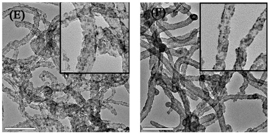 TEM images of Pd/CNTs composite with different metal loading (A) 6.1%, (B) 11.5%, (C) 20.6%, (D) 33.8%, (E) 48.6%, and (F) 58.0%.