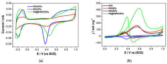 The as-prepared composite was characterized by cyclic voltammetry in H2SO4 (0.1 M) to further verify the successful decoration of Pd surface by PdPt alloying. The CV curves for Pd/CNTs, Pt/CNTs and Pd@PdPt/CNTs are presented in Figure 4a. A noticeable change can be observed for the Pd/CNTs after modification by Pt. In the characteristic hydrogen region, namely between −0.24 V and 0 V (vs SCE), both the adsorption and desorption peaks shifted negatively. On the other hand, considering the metal oxide reduction region between 0.4 V and 0.8 V, the intensity of the metal oxide reduction peak decreased for Pd@PdPt/CNTs compared to that of Pd/CNTs accompanied by a positively shift of the onset potential, which indicates the coating of PdPt alloy on the surface of Pd nanoparticles. These results can be attributed to the presence of PdPt alloy on the surface of Pd nanoparticles, which could modify the hydrogen adsorption and desorption characteristics and the metal oxide formation and reduction upon electrochemical cycling [49].