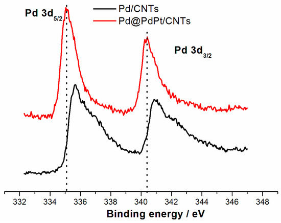 The Pd@PdPt/CNTs catalyst displayed an excellent electrochemical performance towards methanol oxidation. The CVs of methanol oxidation in H2SO4 solution (0.1 M) containing methanol (0.1 M) using Pt/C, Pt/CNTs Pd/CNTs, and Pd@PdPt/CNTs are displayed in Figure 4b. The current values were normalized to the total metal mass of catalysts measured by ICP-MS. It is well known that Pd is inert towards methanol oxidation. The CV of Pd/CNTs in H2SO4 (0.1 M) containing methanol (0.1 M) shows no observable peak corresponding to methanol oxidation which confirms the inactiveness of Pd towards methanol oxidation. However, the Pd@PdPt/CNTs displayed superior activity for methanol, as demonstrated by the CVs in Figure 4. The specific mass activity at 0.55 V on Pd@PdPt/CNTs (400.2 mAmgPt−1) is 2.8 times that of commercially available Pt/C (142.8 mAmgPt−1) and 2.4 times of Pt/CNTs (164.1 mAmgPt−1). Compared to Pt containing electrocatalyst towards methanol oxidation reaction in the literature, as-synthesized Pd@PdPt/CNTs demonstrates a higher specific mass activity as summarized in Table 2. Moreover, the onset potential for the methanol oxidation revealed a negative shift of around 40 mV for the Pd@PdPt/CNTs (ca. 0.117 V) compared to that of Pt/C and Pt/CNTs (ca. 0.153 V). The enhanced electrocatalytic activity of the Pd@PdPt/CNTs could be ascribed to the synergetic effect caused by the formation of the PdPt alloy. The PdPt alloy has a modified electronic structure compared to its monometallic counterparts; therefore, the improvement of electrocatalytic properties results [50,51,52]. To further investigate the electronic structure of electrocatalysts, X-ray photoelectron spectroscopy (XPS) was conducted to study the binding energy of the Pd atoms present. As depicted in Figure 5, the binding energy of Pd5/2 and Pd3/2 for Pd@PdPt/CNTs and Pd/CNTs was 335.1 eV, 340.4 eV and 335.7 eV, 340.9 eV, respectively. The binding energy for the Pd@PdPt/CNTs was lower than that of the Pd/CNTs unambiguously, indicating the modification of the electronic structure due to the alloy formation. The surface ratio of Pd to Pt measured by XPS analysis is found to be around 1:1, which is lower than the atomic ratio of Pd to Pt measured by EDX analysis (2.6:1). It could be explained that XPS analysis is a surface characterization method without detecting the signal originating from the Pd core and thus resulting in a higher atomic ratio of Pt. This finding is consistent with the Pd@PdPt/CNTs core-shell structure as proposed.