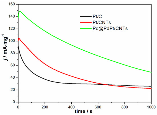 3.3. Electrochemical Characterization of Pd@PdPt/CNTs Electrocatalyst