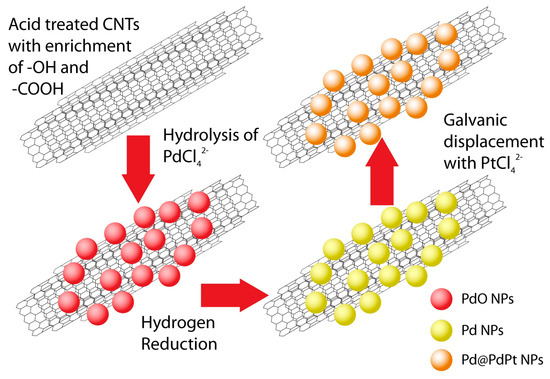 The schematic diagram illustrates the synthesis of Pd@PdPt/CNTs nanoparticle electrocatalyst.