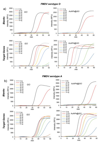 As shown in Figure 2, non-specific signals for blanks (for both FMDV serotype O and A assays), which might be generated by primers, were gradually delayed when 10 ng of GO or AuNPs@GO nanocomposite was added, and completely disappeared when 20 ng or more was added.