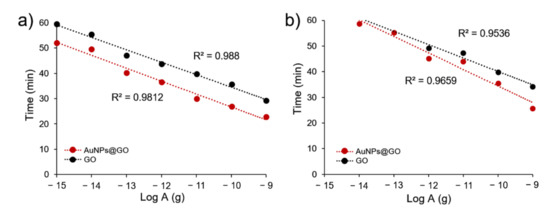 To compare the detection efficiency for FMDV genes of GO and AuNPs@GO nanocomposite, time-dependent standard curves were obtained using the cycle quantitation values (Cq) of LAMP assays. As shown in Figure 4, the use of GO and AuNPs@GO nanocomposite produced linear relationships from 1 fg to 1 ng using FMDV serotype O genes. Additionally, the results of GO and AuNPs@GO with FMDV serotype A ranged from 1 pg to 1 ng and from 10 fg to 1 ng, respectively. Further, the fluorescent signals for AuNPs@GO nanocomposite with FMDV serotype O were assessed to be approximately 7 min faster than those with GO at all target concentrations.