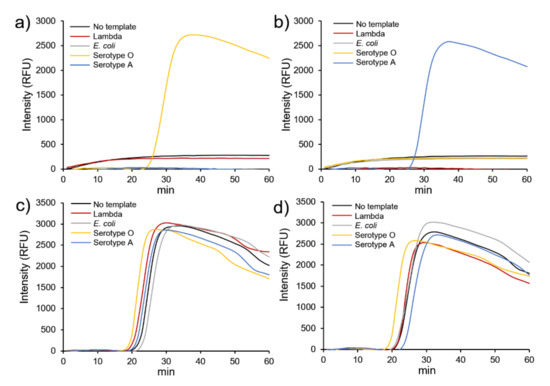 As shown in Figure 5a,b, the addition of AuNPs@GO nanocomposite specifically generated fluorescence signals for the target DNA (serotypes O and A) at 28 and 29 min, respectively, displaying no signal for Lambda DNA and E. coli DNA. Meanwhile, we found that without AuNPs@GO nanocomposite, the target DNA produced fluorescence signals at 24 and 25 min, and Lambda DNA and E. coli DNA produced signals at 22 and 24 min, respectively. These results indicate that AuNPs@GO nanocomposite specifically yielded positive detection with serotype O and A primers, not allowing amplification of other DNA templates. These significant differences demonstrate that our proposed method could identify different types of FMDV by specifically detecting serotypes O and A DNA, showing an excellent specificity for target DNA.