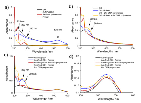 These results demonstrate that AuNPs@GO nanocomposite has a stronger interaction with primers than GO. Additionally, as shown in Figure 6d, the representative wavelength peak of AuNPs on GO sheets at 523 nm were slightly shifted to 525 nm with addition of Bst DNA polymerase, which indicates an interaction between AuNPs and Bst DNA polymerase.