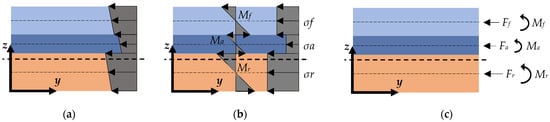 (a) Residual stresses stored in the materials during the fabrication process of the cantilever. (b) Uniform stresses and intrinsic stress gradients that form the total residual stresses. (c) Equivalent system of axial forces and moments.