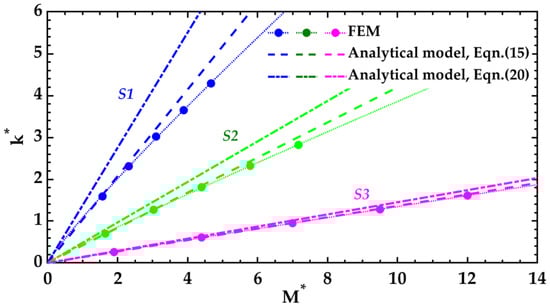 Normalized curvature k* vs. normalized internal bending moment M* for the cantilevers S1, S2, and S3. The dotted curve with circular markers corresponds to the results estimated by FEM. The dashed line represents the results obtained by the analytical model (Equation (15)). The dash-dotted line shows the results obtained by the analytical model if the parameters related to the adherence layer and intrinsic stress gradients are not considered (Equation (20)).