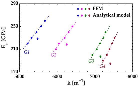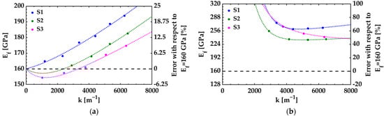 Nonlinear deflection of cantilevers can have a significant impact on the accuracy of the analytical model. The Young’s modulus of the tested film (Ef) is calculated from the curvatures obtained by FEM using Equation (15). Figure 5a shows the calculated Ef values with respect to the curvatures exhibited in each cantilever (k). As expected, the analytical model solutions deviate from the real value of Ef as the deflections increase. However, it is confirmed that the errors produced by nonlinear effects are greater on the cantilevers with smaller thickness (cantilever S1). In other words, for cantilevers with very thin tested films and adherence layers, the accuracy of the analytical model improves with higher hr values.