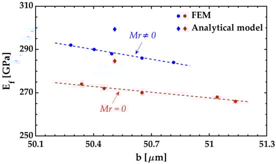 The Young’s modulus values of the 288 nm thick Si3N4 tested films found through the models proposed in this work are listed in Table 4. The results of the analytical model agree well with those obtained by FEM. The incidence of the intrinsic gradient of the SiO2 layer has on the results was studied by repeating the calculations with Mr = 0. The elimination of Mr leads to an underestimation of 4.9 and 5.7% in the Ef values estimated by the analytical and FEM models, respectively.