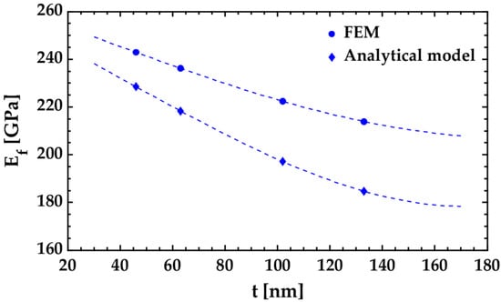 The Young’s modulus of the tested film Ef is obtained by numerically solving the system of linear equations composed of Equations (1) and (4)–(14). However, the analytical model can be reduced to a single expression: