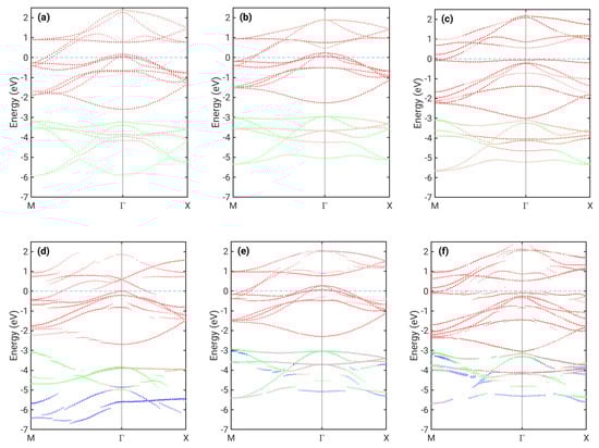 - Freitas, R.R.Q.; de Brito Mota, F.; Rivelino, R.; de Castilho, C.M.C.; Kakanakova-Georgieva, A.; Gueorguiev, G.K. Tuning band inversion symmetry of buckled III-Bi sheets by halogenation. Nanotechnology 2016, 27, 055704. [Google Scholar] [CrossRef] [PubMed]