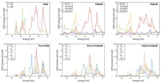 The Fermi level for the case of the NM IC1 configuration is positioned differently in terms of the bands corresponding to the former hole and electron pockets. By comparing Figure 2b,d, we observe that some bands originally crossing the Fermi level are pushed below it, with only a small hole pocket at Γ remaining. However, our calculations do not show a significant charge transfer between Si and FeSe. In order to understand the shift of the Fermi level relative to different bands, we have also extracted the orbital-resolved DOS for Fe atoms, shown in Figure 3. We first note that for FeSe on Si, the degeneracy between and orbitals is lifted due to the reduced symmetry in the system. Interestingly, this loss of degeneracy has also been observed in bulk FeSe as a consequence of the nematic order [,]. The occupations of different orbitals change significantly between the free-standing 1ML NM case and the case of FeSe on Si (IC1). In particular, the occupation of is increased, while that of and is reduced (Table 1). This seems to be connected to the fact that the two FeSe electron pockets located at the M point become flatter when in the IC1 configuration. Furthermore, the outer one of them (mostly of character) is strongly hybridized with Si. The charge from these bands is transferred to hole pockets near Γ, which become almost fully occupied. The small peak in the interfacial Si DOS near eV indicates hybridization with Fe states. At approximately the same energy, a peak in the contribution to Fe(2) DOS is present without a counterpart in the free-standing ML. The strong coupling between Fe(2) and Si thus appears to be facilitated predominantly by states, which are extended spatially in the direction of the Fe(2)–Si bond.