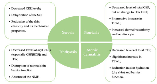Several skin diseases were associated with epidermal barrier impairment and perturbations of the SC lipid composition [19,26] such as xerosis, ichthyosis, AD, and psoriasis [9]. The main characteristics of these pathological skin disorders are summarized in Figure 2.