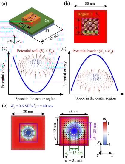 Figure 1e presents a nucleated isolated skyrmion with diameter d in the nanostructure under inhomogeneous PMA distribution as Kc = 0.6 MJ/m3 and a = 40 nm. In order to elucidate the effect of inhomogeneous PMA on the skyrmion size, we calculated the special diameter of isolated skyrmion dc or du, in which a homogeneous PMA with anisotropy of K = Kc or Ku is set over the whole square nanostructure. Generally, the skyrmion diameter reduces with increasing the homogeneous PMA strength [17,18,26], and the simulated results showed that du = 13 nm for K = Ku = 0.8 MJ/m3 and dc = 31 nm for K = Kc = 0.6 MJ/m3 in the homogeneous PMA, as marked in Figure 1e. Remarkably, the inhomogeneous PMA distribution here changes the energy distribution over the nanostructure, making the skyrmion diameter d greatly different from du or dc in the homogeneous PMA.