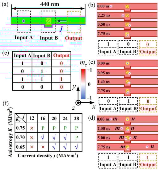Figure 4 shows the sketch of logic device and operation of logic AND functions. In Figure 4a, the logic device is mainly composed by three regions, that are the ‘Input A’, ‘Input B’ and ‘Output’ regions. Both ‘Input A’ and ‘Input B’ regions were used as the input terminals of skyrmion information carriers, and the ‘Output’ region was used as the output terminal of the skyrmion information carriers. Magnetic anisotropy in the ‘Input A’ region was set as a constant Ku = 0.8 MJ/m3, and PMA for the capping island in ‘Input B’ region was fixed as Kc = 0.7 MJ/m3 in Figure 4b–d. In the implement of logic operations, the existence or absence of a skyrmion in these regions represents the data bit ‘1’ or ‘0’, respectively.