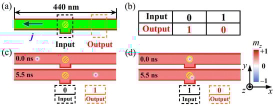 Besides working as AND logic operations, nanotracks with various geometries and sizes of capping nano-islands can be extended for exploiting other possible logical functions. We proposed the nanotrack with circle-shaped capping nano-island in Figure 5a, and employed the similar scheme that used in the AND logic operations to nucleate the skyrmion and manipulate its motion in the nanotrack. It can be seen in Figure 5c,d that, the operations of 0 → 1 and 1 → 0 are attained in the nanotrack, which achieves the logic NOT operation (see Figure 5b). Therefore, the logic AND and NOT operations were successfully realized in the proposed racetrack logical devices.