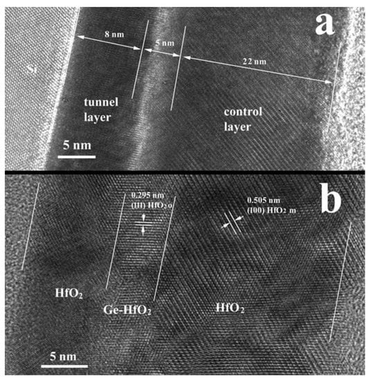 The HRTEM image of the thin film cross section, confirming the widths of the layers, is presented in Figure 1. The contrast in the image in Figure 1a is strongly correlated with the atomic Z number, and the white row in the Ge-HfO2 intermediate layer indicates the position of the high concentration of Ge atoms (including Ge dots). The contrast in the image in Figure 1b is mainly a phase contrast specific for HRTEM images. Here, we observe the presence of crystallographic correlation between the orthorhombic phase present in the mixed layer (HfO2o) and the monoclinic phase present in the control layer (HfO2m). Details of the origin of ferroelectric behaviour in the 3-layer stack can be found in [].