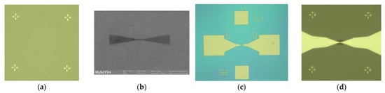 Optical images of the following fabrication steps: (a) alignment marks fabrication, (b) patterning using e-beam lithography, (c) source and drain contacts fabrication by e-beam, and (d) gate insulator deposition.