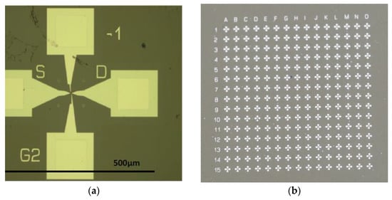The fabrication of the graphene monolayer/HfGeO devices at the wafer level is performed following these steps: (a) alignment marks fabrication, implying patterning (resist-PMMA 950k C2) using e-beam lithography (Raith e_Line, 30 k) followed by Ti (5 nm)/Au (95 nm) metal deposition by e-beam evaporation (Temescal FC 2000, Livermore, CA, USA) and lift-off, (b) graphene shaping by patterning the graphene channel using e-beam lithography (resist PMMA 950k A2) and RIE in O2 plasma, (c) source and drain contacts fabrication by e-beam lithography patterning (resist PMMA 950 k C2) and Ti (5 nm) /Au (35 nm) deposition by e-beam evaporation followed by lift-off, (d) gate insulator deposition patterning by e-beam lithography of the 40-nm-thick HSQ-(hydrogen silsesquioxane) gate insulator and the fabrication of metallic gate contacts. The optical images corresponding to the above-mentioned fabrication steps are displayed in Figure 2, while Figure 3a,b show the optical images of a single graphene/HfGeO FET with two top gates and a backgate (doped Si) and, respectively, the optical image of a 225 graphene/HfGeO FET array.