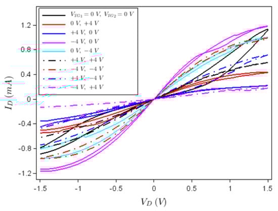 The working of the memristor as reconfigurable logic gate can be understood with respect to the ID–VD characteristics in Figure 4. In this sense, the gates are programmed to have the values +4 V, −4 V and 0 V. The input for a logical gate level is considered as logic “0” if 0 V is applied, irrespective of the gate type, the logic value 1 being attributed otherwise. The output is encoded in ID (in the forward direction) for a drain voltage of 1 V; if we consider as reference/threshold the drain current level when VTG1 = VTG2 = 0 V, the drain current value above this threshold is associated to logic value 1, while the value below it is defined as logic value 0. Then, we have the logic table displayed as Table 1; the threshold drain current values for the OR and AND gates are 0.5 mA, whereas for XOR the corresponding value is 0.4 mA. The output could alternatively be considered the drain resistance RD which, at a certain voltage, increases and decreases in the same way as ID. Thus, we can attribute to RD the same logical value as to ID and, hence, we can implement in the same way the AND, OR and XOR logic gates.