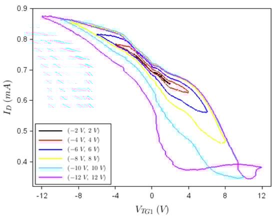 A comparison of our results with similar results obtained for a dual-gate memtransistor having MoS2 as channel instead of graphene monolayer [] is presented in Table 2. The parameters taken into account are the maximum drain current, ID,max, the maximum voltage values for the top and back gates, VTG,max and VBG,max, the maximum drain voltage, VD,max, the on–off ratio, and the memory window.