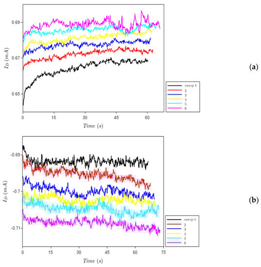 Figure 7a,b show the behaviour of ID in time for a positive (+1 V) and a negative (−1 V) drain voltage, respectively, at various voltage sweeps denoted by 1, 2, etc. We see that when a positive voltage is applied, the current increases and the conductance decreases, while the opposite occurs when the sign of the drain voltage is reversed. This is the typical behaviour of an electronic synapse, where the decreasing of conductance is attributed to potentiation, while the conductance increase is attributed to synapse depression [,].