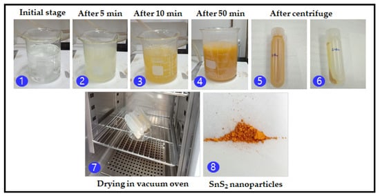 The procedure for the synthesis of SnS2 nanoparticles is shown in Figure 1. A simple chemical precipitation method was used to synthesize SnS2 nanoparticles. For a typical synthesis, 0.1 M of stannous chloride, 0.8 M of thioacetamide, and 1 M of trisodium citrate were aggressively stirred on the magnetic hot plate. The solution was allowed to react for 50 min at a constant temperature of 60 °C with a solution pH of 2. The SnS2 nanoparticles were collected and cleaned using deionized water before drying in a vacuum oven at 70 °C for 4 h. Finally, the as-synthesized SnS2 nanoparticles exhibited a golden yellow hue. The SnS2 nanoparticles/powder was collected in a vial and desiccated for further analyses.