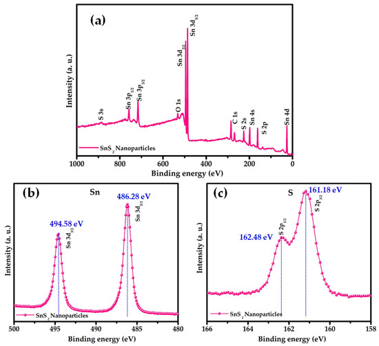 XPS was used to characterize the composition of the prepared nanoparticles. No significant peaks representing the contaminants were found in the spectra, suggesting that the impurity level was less than the XPS resolution limit (1 at %). Figure 4a shows a typical high-resolution spectrum of the as-synthesized SnS2 nanoparticles with binding energy ranging from 0 to 1000 eV. The wide spectrum revealed numerous peaks, such as S 2s, double S 2p, Sn 3s, doublet Sn 3p, doublet Sn 3d, and Sn 4d, indicating that the synthesized nanoparticles contain Sn and S elements. The peaks linked to C and O were possibly caused by ambient pollution. No other peaks corresponding to other elemental impurities were found in the spectrum. Figure 4b,c show the narrow XPS scans of the Sn 3d and S 2p peaks, respectively. A core-level scan of the Sn 3d doublet revealed two peaks with binding energies of 486.3 eV and 494.6 eV, corresponding to the Sn 3d5/2 and Sn 3d3/2 energy levels of Sn atoms in the Sn4+ valence state, respectively. The peak splitting energy of Sn 3d5/2 and Sn 3d3/2 levels was approximately 8.3 eV. The binding energies of Sn 3d doublets and their spin energy separations were similar to the values reported [33]. A complete spectrum of the S 2p core level revealed two peaks with binding energies of 162.5 eV and 161.2 eV, which correspond to the S 2p5/2 and S 2p3/2 energy levels of S atoms in the Sn2− valence state, respectively, which is consistent with the energies of the S2−–Sn4+ bond, confirming the presence of a single-phase SnS2 in the synthesized nanoparticles [34].