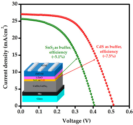 The J–V characteristics of the CIGS devices with conventional CdS and SnS2 buffer.